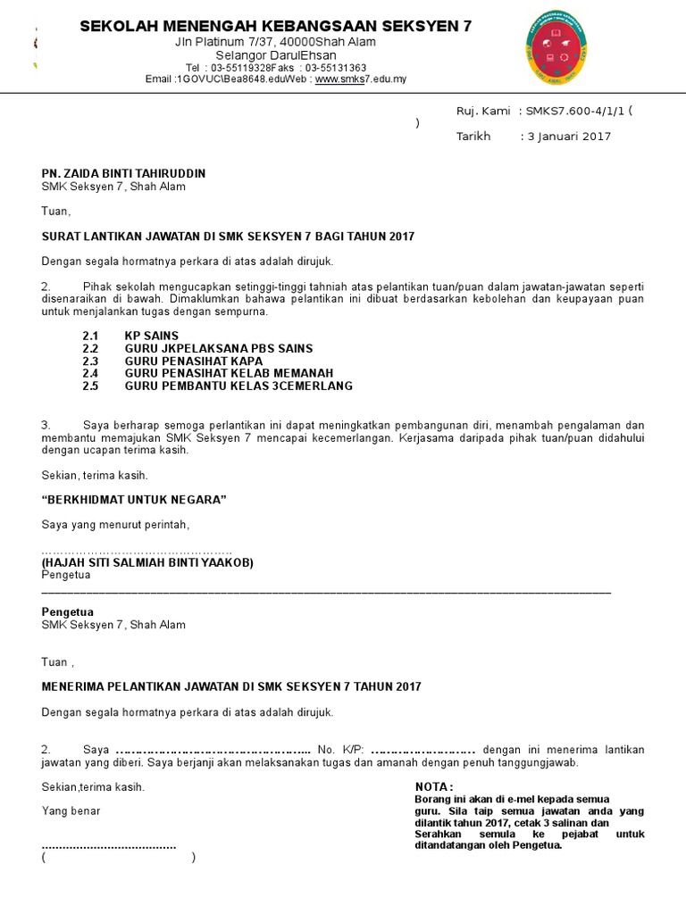 Bersama-sama ini disertakan akuan persetujuan ibu bapa penjaga yang perlu diisi dan dikembalikan kepada pihak sekolah. Mengutip dari buku Pedoman Lengkap Menulis Surat Adlan Ali dan Tanzili 2006 menjelaskan bahwa terdapat komponen-komponen Surat Tugas dari Kepala Sekolah yang secara umum sebagai berikut. Contoh surat perlantikan jawatan page 1 line 17qq com.